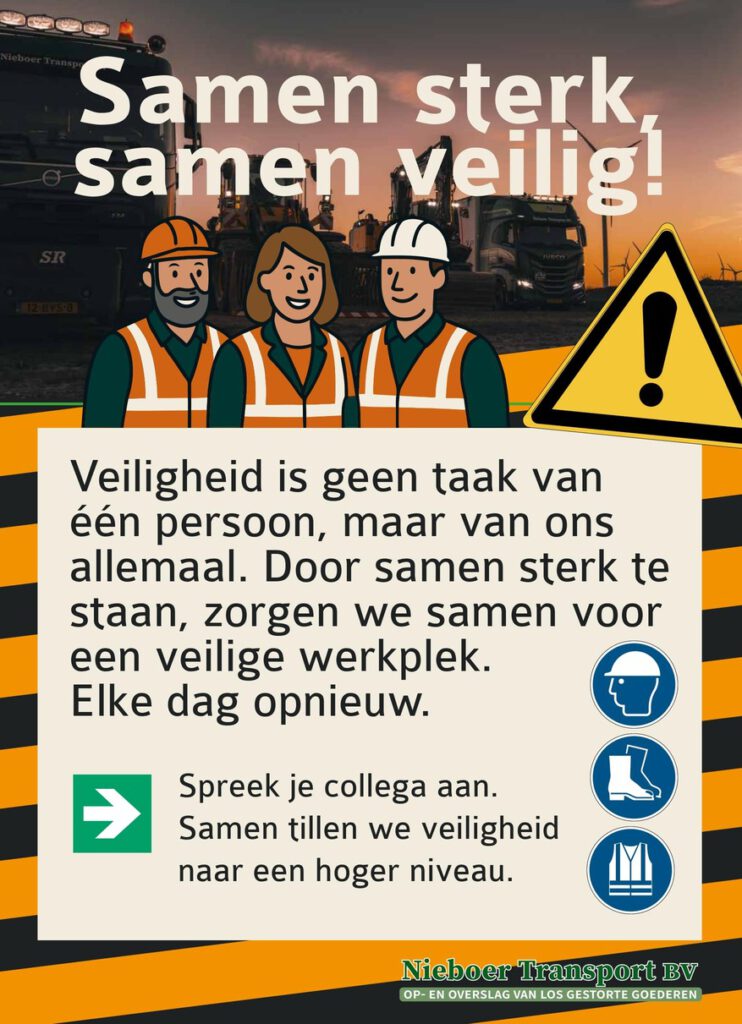 Bij Nieboer Transport geloven we dat écht veilig werken begint met respect, samenwerking en verantwoordelijkheid. Onder het motto “Samen Sterk, Samen Veilig” zetten we ons elke dag in voor een veilige en prettige werkomgeving binnen de transport- en GWW-sector.